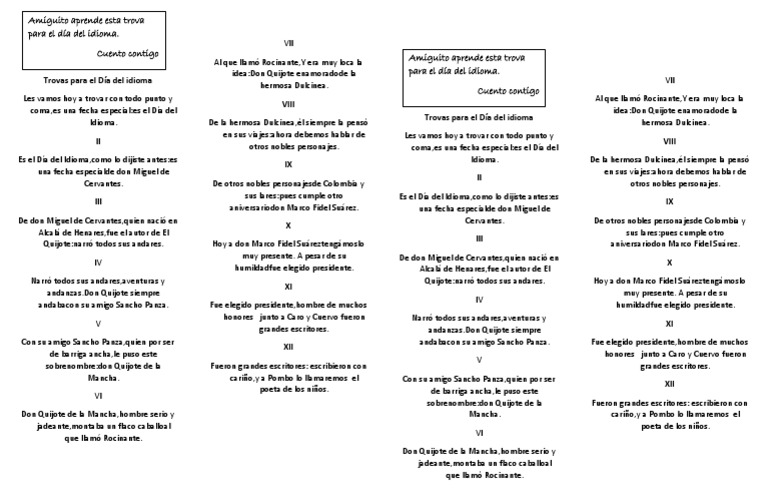 Trovas para el día del idioma.docx. La celebración de este día fue una decisión espontánea, tomada en la conferencia general de la unesco, que se celebró en parís en 1995, para rendir un homenaje. Si bien cervantes saavedra fallece un 22 de abril del año 1616, según la costumbre de la época, se registró su muerte el día de su entierro. 21 abril, 2016 en 3:11 pm. En honor a cervantes, el 23 de abril se celebra mundialmente el día del idioma español.